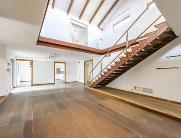 Una scenografica SCALA di DESIGN conduce al primo piano, dove si apre un generoso pianerottolo con parapetto in vetro/cristallo, che affaccia sulla zona giorno, creando un collegamento visivo moderno e arioso tra i piani.