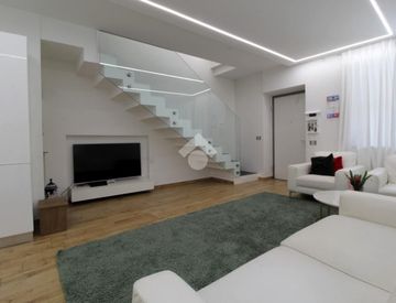 Entrando dalla porta d'ingresso blindata al piano terreno si accede al luminoso soggiorno dotato di camino ed alla comoda zona living con cucina a vista, il tutto caratterizzato da abbassamenti dotati di strisce led, oltre ad un bagno di servizio finestrato dotato di doccia.