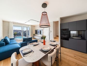 La villa, arredata con finiture e arredi di altissimo livello, si sviluppa su tre livelli oltre a una terrazza solarium di 30 mq, pensata come raffinata area relax attrezzabile anche con vasca idromassaggio. Gli spazi sono progettati per garantire luminosità, armonia e una perfetta continuità tra interno ed esterno.