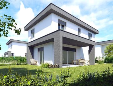 In PROSSIMA REALIZZAZIONE disponiamo di VILLA SINGOLA di comm. 170mq, disposta su due livelli cosi composta: Ingresso, soggiorno ampio, cucina abitabile con affaccio su portico di 20 mq, servizio, collegamento con la zona lavanderia/locale tecnico e box doppio in larghezza, scala interna al piano primo n. 1 camera matrimoniale con cabina armadio, n. 2 camerette e servizio. Il tutto con 300 mq di GIARDINO circostante disposto su tre lati. NESSUNA SPESA...