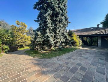 Piano terreno: Un portico coperto accoglie l’ingresso con taverna di buone dimensioni, ideale per ricevimenti e momenti conviviali. Sullo stesso livello si trovano una camera, un bagno di servizio, la lavanderia, una cantina e il locale tecnico. L’ampia area esterna pavimentata offre comodi spazi per la sosta di più autovetture, box auto e un accesso diretto al giardino che circonda la proprietà.