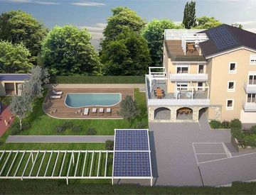 - al secondo piano dal quale si gode di una parziale vista lago appartamento suddiviso in ingresso, salone con balcone, camera con balcone, cucina e bagno. Sullo stesso livello appartamento indipendente con ingresso, sala con balcone con affaccio sul parco, camera da letto e bagno.