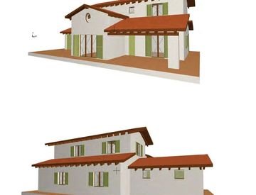 Il progetto attuale prevede la seguente composizione: piano terra: ingresso su soggiorno, ampia cucina, camera, antibagno e bagno, box auto doppio e porticato; piano primo: ulteriori due camere da letto e bagno
