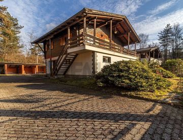L’immobile, edificato nel 1974, presenta una tipologia costruttiva in stile rustico montano, assimilabile a una baita, con il legno come elemento architettonico predominante, in particolare al piano superiore.