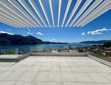 Al secondo ed ultimo piano, raggiungibile dalle scale interne che danno accesso a tutti i piani, si estende una terrazza di dimensioni eccezionali con parapetti in vetro per garantire la spettacolare vista del lago senza alcun ostacolo visivo, e di tutte le colline limitrofe