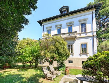 Unica nel suo genere, incantevole proprietà con grande parco pianeggiante di circa 3000 mq e piscina, in uno dei quartieri residenziali più ricercati della cittadina ed a pochi minuti a piedi dal lago.
