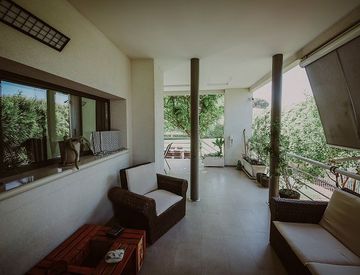 Un accattivante mix di elementi assolutamente contemporanei e richiami alla tradizione caratterizza il design degli interni. La villa è distribuita su tre livelli: al piano principale la zona giorno open space accede alle verande e confluisce armoniosamente verso l'immenso manto verde arredato con un gazebo bianco.