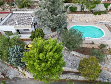 La villa dispone di tre comodi vani letto e doppi servizi, rendendola ideale per famiglie o per chi desidera avere spazio in abbondanza. L'area esterna di circa 1200 mq è un vero gioiello, con pini secolari che offrono ombra e bellezza. La piscina sul belvedere regala una straordinaria vista mare, creando un'atmosfera da sogno per le calde giornate estive.