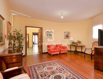 L'ampio salone è il cuore di questa bellissima proprietà, illuminato da due grandi finestre e da una porta a vetri che consente l'accesso al giardino di 380 mq, preceduto da una veranda di 60 mq attrezzabile per vivere la casa anche all'esterno.