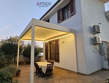 Disposta su tre livelli è composta da ingresso dal portico sul salone con uscita posteriore sul giardino dotato di una elettro pergola con illuminazione a LED, cucina abitabile con grande finestra con riduzione di dispersione e bagno di servizio al piano terra;
