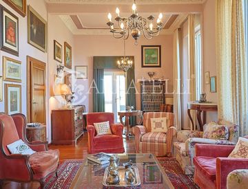 Al piano terra, troviamo un ampio salone di rappresentanza con ampie finestre e alti soffitti decorati, la sala da pranzo e lo studio. La cucina, pratica e luminosa, si collega con l’esterno attraverso un accesso diretto alla limonaia e alla zona del forno a legna, perfetto per serate rustiche in giardino. Sempre al piano terra, troviamo uno dei tre bagni e una sala soggiorno con camino.