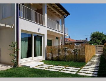 RIF 932 – A circa 600 mt. dal mare bellissima porzione di villa bifamiliare di nuova costruzione di circa 100 mq. disposta su due piani fuori terra con giardino. Nel suo interno così composta: PIANO TERRA: ingresso indipendente, ampio soggiorno con zona pranzo, cucina, disimpegno, una camera da letto matrimoniale, un bagno e portico; PIANO PRIMO: disimpegno, una camera da letto matrimoniale con soppalco e proprio bagno privato ed ampio balcone, ulteriore...