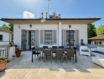 In ottime condizioni di manutenzione, la proprietà garantisce ambienti ampi e luminosi, arricchiti da numerosi comfort, tra cui aria condizionata, stazione di ricarica per auto elettriche, posti auto interni e cancello automatizzato. L'intera proprietà è completamente recintata, con un giardino che circonda la villa sui quattro lati, sapientemente attrezzato con un raffinato dehors.