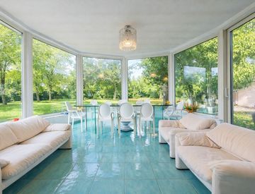 Il salone, a pianta semi-ellittica, è forse l’ambiente più suggestivo della villa. Un vero e proprio “giardino d’inverno”, avvolgente e scenografico, dove le pareti di vetro permettono di vivere il giardino anche nei mesi più freddi. Qui il tempo sembra rallentare: uno spazio dedicato al relax, alla lettura, alle conversazioni, riscaldato dal tepore della stufa a pellet.