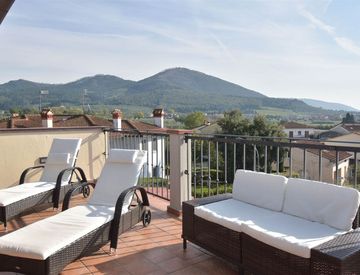 Da qui si accede al gioiello della proprietà: un magnifico terrazzo panoramico da cui lo sguardo abbraccia la piana di Prato. Un luogo pensato per vivere la bellezza: cene sotto le stelle, momenti di relax, letture all’aria aperta o semplicemente attimi di silenzio con vista.