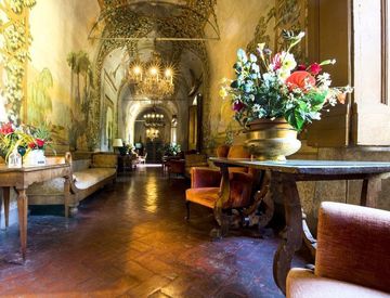 Nel cortile è presente un muro merlato. Notevole impatto la loggia che guarda il giardino all’italiana lunga oltre trentacinque metri.