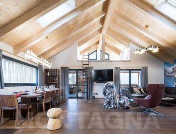 La zona giorno open space, ampia e ariosa, è impreziosita da un camino centrale e da grandi vetrate che incorniciano le Dolomiti, creando un’atmosfera di rara armonia. La cucina, moderna e perfettamente attrezzata, si integra con il soggiorno e si apre su una terrazza panoramica esposta a sud-ovest, ideale per pranzi all’aperto o momenti di relax.