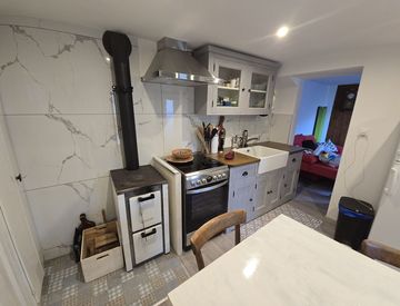 - Cucina/pranzo con piano in vetroceramica, forno, frigorifero e antica stufa a legna con piastra cottura
