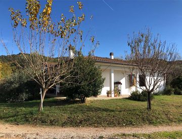 La proprietà, arricchita da due portici perimetrali di 61 mq, è suddivisa in due appartamenti autonomi ed è circondata da un giardino esclusivo di circa 3600 mq dotato di pozzo di acqua sorgiva.