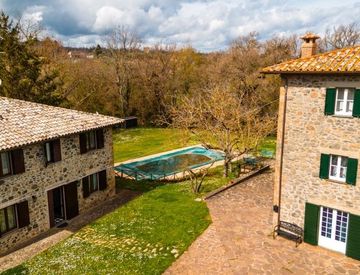 A pochissimi minuti da Orvieto, in posizione panoramica e dominante, in un contesto riservato ma a due passi dai servizi del paese vicino, si trova questa importante proprietà in vendita costituita da un ampio casale padronale e un secondo casale in pietra con piscina e corte di circa 1 ha.