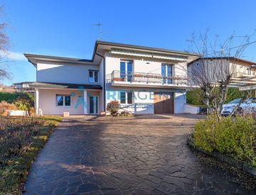 La villa presenta caratteristiche esclusive: il giardino fronte strada dispone di circa 165 mq pavimentati in porfido, arricchiti da una pompeiana con tenda retrattile ideale come posti auto coperti. Un’area gioco attrezzata rende la proprietà perfetta anche per le famiglie, mentre la casetta in legno offre ulteriore spazio dedicato ai più piccoli.