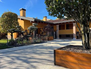 Grande giardino che circonda l'intera proprietà ben curato con piante ornamentali ad alto fusto e angolo orto; pavimentazione esterna di nuova realizzazione per area manovra auto che porta ai 3 garage interrati con possibilità di parcheggio per 4 auto.