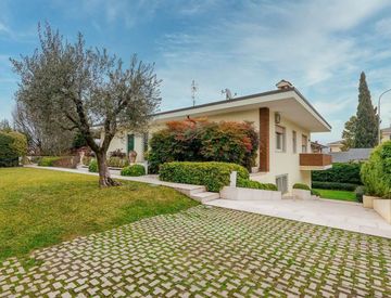 SONA. Prestigiosa Villa singola su un lotto di 1200 mq circa, in zona strategica per gli spostamenti verso la città e il lago, disposta su un unico livello al piano terra oltre accessori al piano scantinato e con annesso un appartamento al piano seminterrato, più precisamente composta: