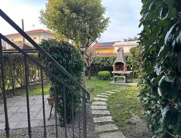 Da strada privata con ingresso indipendente l'immobile si compone da ingresso in sala con cucina a vista, antibagno e bagno con doccia e finestra, dalla sala usciamo nel balcone loggiato che conduce al giardino privato di 100mq. Salendo al livello superiore con altezze abitabili troviamo due camere matrimoniali, una media, bagno con finestra, due balconi.