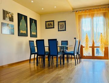 L'ampia zona giorno è perfetta per accogliere amici e familiari, con un accogliente angolo salotto e un tavolo da pranzo. La cucina abitabile, completa di cucina su misura, si affaccia su una terrazza coperta, ideale per cene all'aperto.