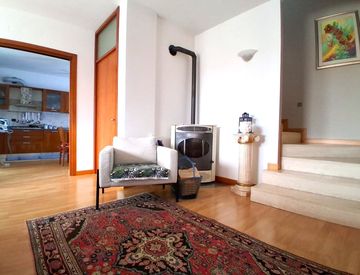 Al piano terra si sviluppa la zona giorno con un ampio salotto d'ingresso impreziosito da stufa a pellet, cucina abitabile separata dalla quale si accede direttamente allo scoperto esterno e ad un poggiolo sul retro. Completano il livello un antibagno e un bagno finestrato per ospiti.