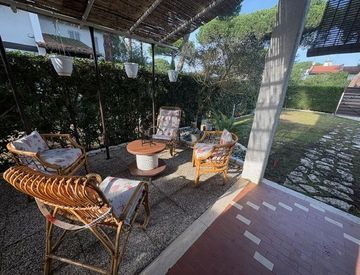 proseguendo nel giardino il punto forte della casa, una vera e propria estensione del soggiorno con un patio bellissimo dove poter pranzare e cenare all esterno.