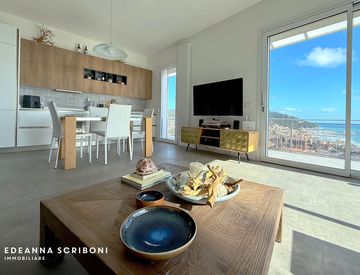 Gli interni, climatizzati e curati nei minimi dettagli, propongono un soggiorno open space con cucina a vista, dove le tonalità di bianco, grigio, blu e legno si fondono per creare un ambiente elegante e funzionale. Le grandi vetrate scorrevoli, oltre ad inondare di luce naturale l’area living, conducono ad un ampio terrazzo che percorre due lati della proprietà, regalando una vista mozzafiato su tutta la costa.