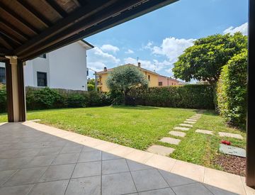 La ampia cucina abitabile è luminosa e accogliente, con accesso diretto al patio coperto e al giardino, perfetta per pranzi e cene all'aperto. Il soggiorno spazioso, dotato di un terrazzino, invita a momenti di relax e convivialità. La zona notte al piano superiore comprende una camera matrimoniale con balcone, due stanze aggiuntive e due bagni moderni.