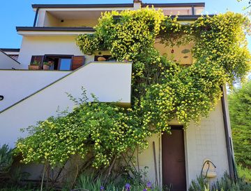 un ampio giardino privato di circa 800 mq, con zone pianeggianti perfette per viversi l'esterno, e parti in discesa che si integrano armoniosamente nel paesaggio collinare, regala un'oasi verde ideale per momenti di puro relax.