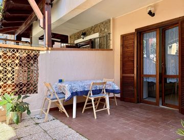 Accogliente giardinetto di ingresso con comoda veranda coperta, ideale per organizzare piacevoli cene all’aperto o per trascorrere momenti di relax in totale privacy.