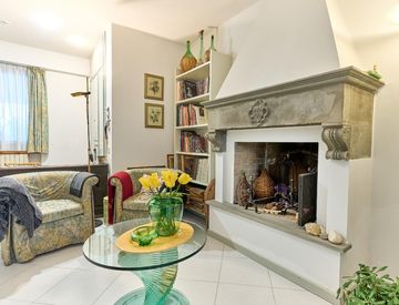 L’ingresso indipendente conduce a un accogliente soggiorno impreziosito da un caminetto con frontone in pregiata pietra serena collegato al giardino da una portafinestra. A completare il piano troviamo un bagno, la lavanderia, un pratico ripostiglio e un locale di sgombero collegato internamente.