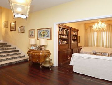 Al Piano Primo collegato al piano terra con una bella scala in marmo stile liberty troviamo un disimpegno che ci dà l'accesso a tre camere matrimoniali delle quali due servite da un balcone, doppi servizi finestrati.