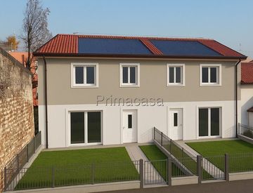 NUOVO: in zona centrale, in corte privata, villetta a schiera disposta su due livelli con giardino privato composta di soggiorno con cucina a vista (41 mq circa), 3 camere da letto, 2 bagni e ripostiglio. Posto auto coperto. Impianto fotovoltaico privato da 3 kW con possibilità di aumento fino a 6 kW, impianto di riscaldamento a pavimento in pompa di calore, predisposizione per impianto di VMC, travi a vista. Rif. 2850.